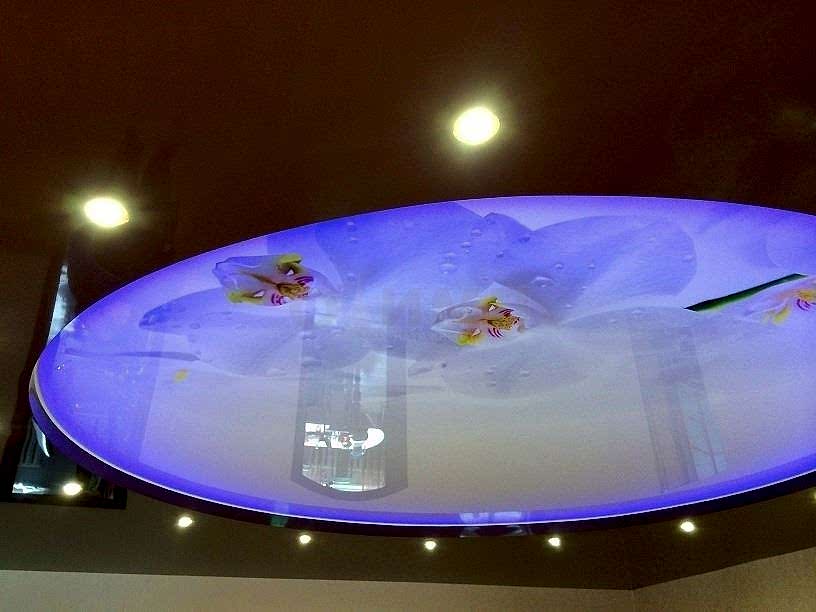 - Сатиновые. Обладают Пин Ап светоотражающим эффектом. Придает декоративности нанесение фотопечати на полотно, точечные светильники.