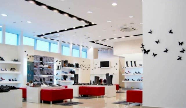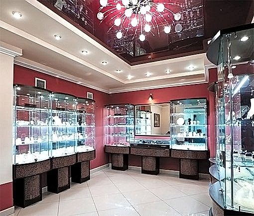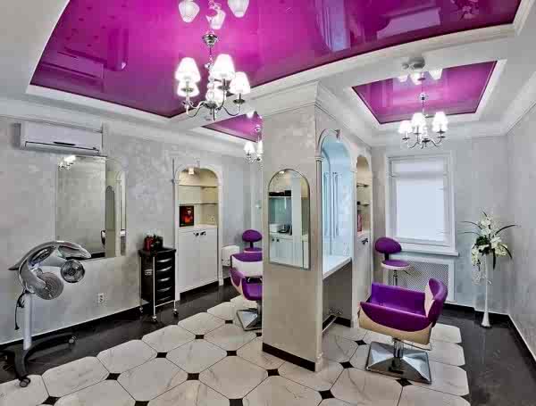 В торговых точках, салонах красоты, ателье, натяжные потолки должны соответствовать общему выбранному стилю Пин Ап и концепции работы в целом. В таком случае могут подойти конструкции из многоуровневых потолков, с разными цветами, яркими запоминающимися логотипами компании, креативными узорами, тематическими изображениями.