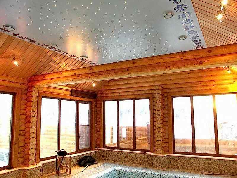 Можно красиво оформить натяжными потолками любую комнату в загородном доме, и Пин Ап сделать уникальной: