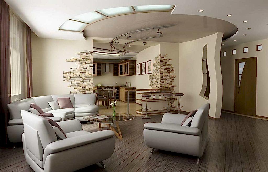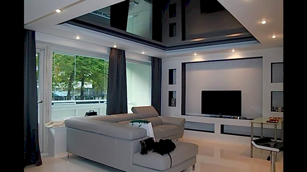 - Гостиная. В стиле «хай-тек» уместны фактурные потолки и глянцевые с зеркальным эффектом. «Классика» и «Прованс» требуют сдержанных фактур - сатиновой и матовой, белого цвета (их цена самая низкая).
